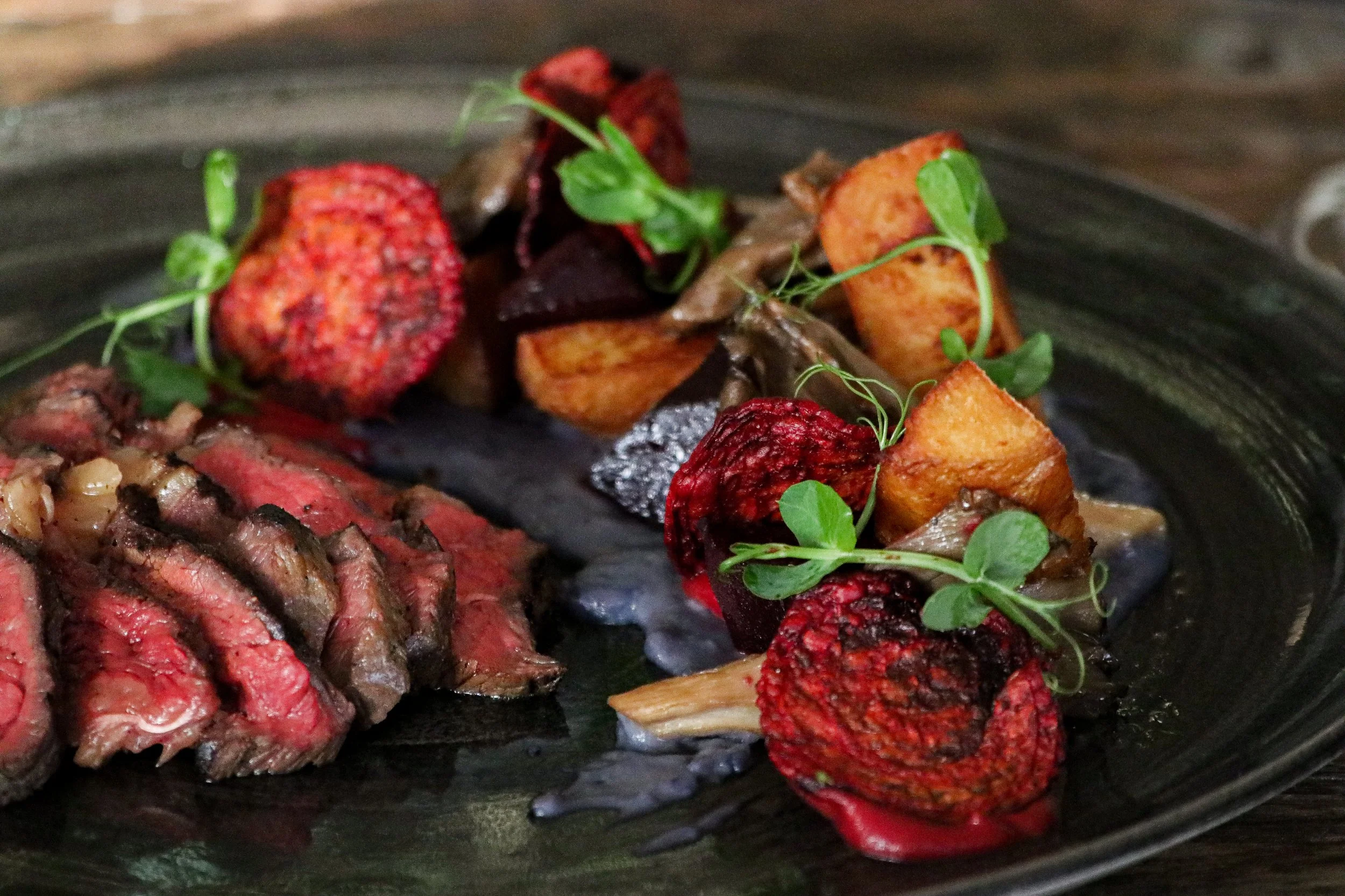 (Beef prime rib, potatoes, oyster mushrooms, beetroots)